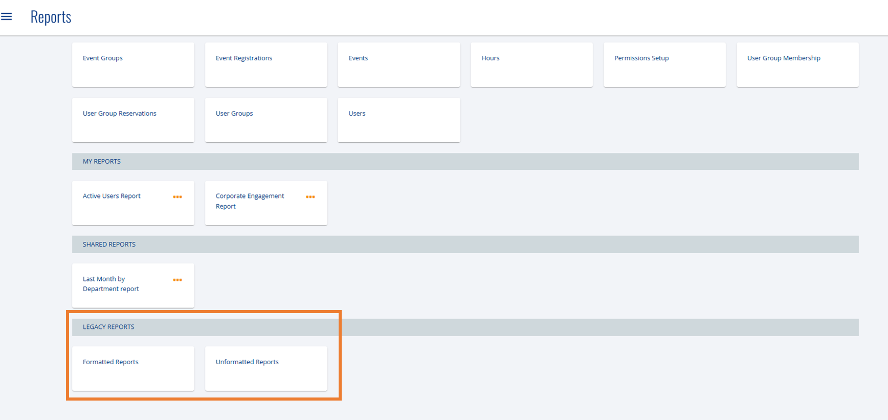To access your Formatted and Unformatted reports, navigate using the Reports tile. This page displays Custom Reports at the top, followed by any saved or shared Custom Reports. Buttons at the bottom allow for accessing Legacy Reports.