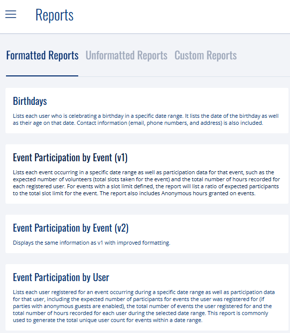 These reports list each event occurring in a specific date range as well as participation data for that event, such as the expected number of volunteers (total slots taken for the event) and the total number of hours recorded for each registered user. For events with a slot limit defined, the report will list a ratio of expected participants to the total slot limit for the event. These reports also includes Anonymous hours granted on events. Each version of this report displays the same information formatted slightly differently.