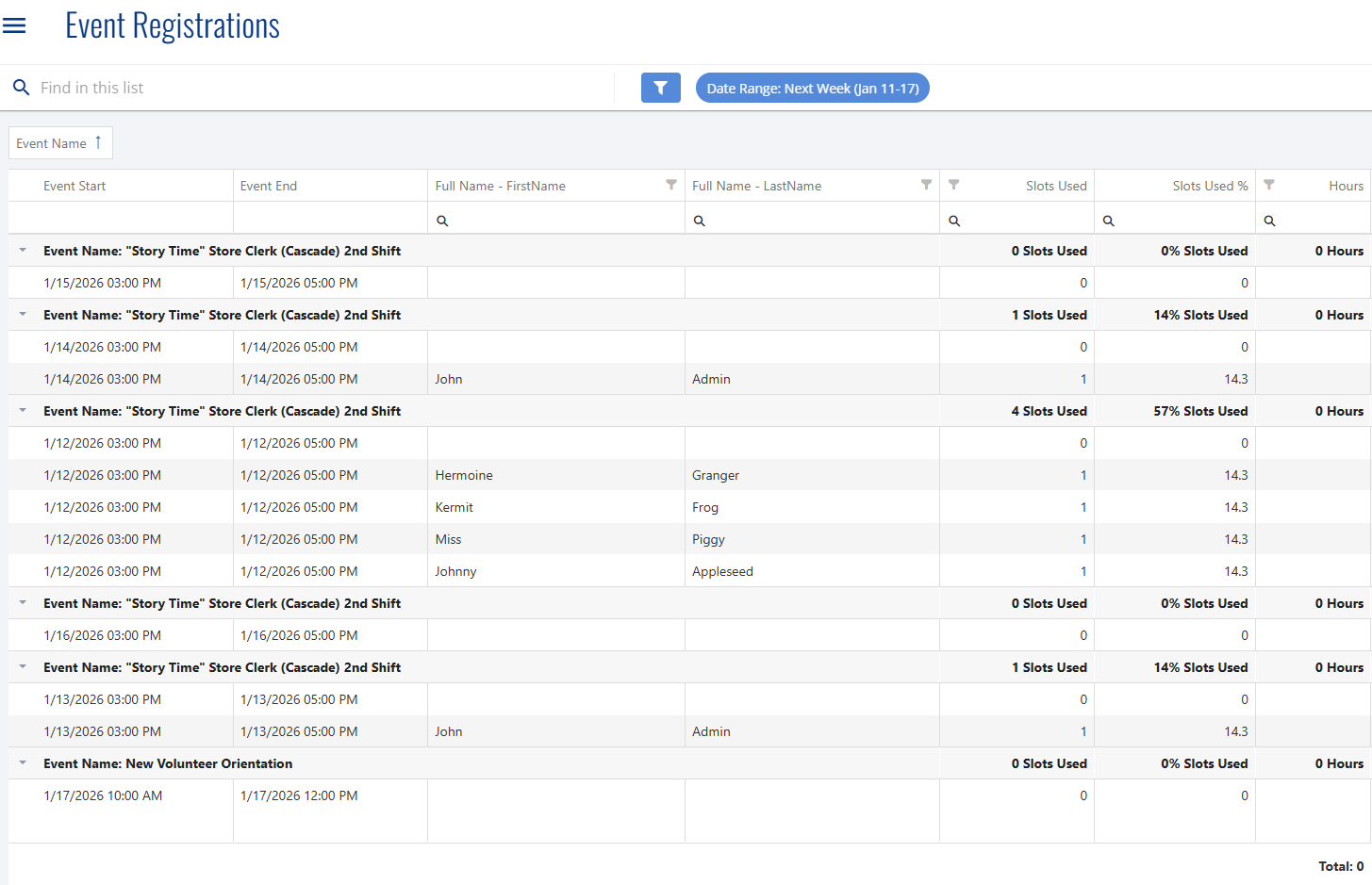 Event Registrations Report | Slots Used Percentage