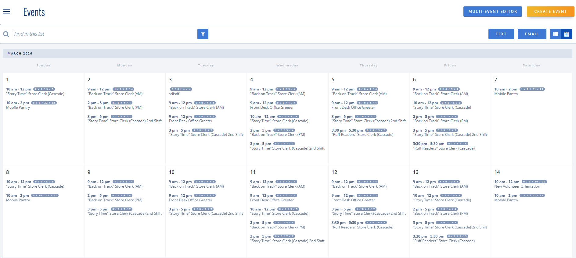 In the example below, 4 volunteers completed 47 hours and took 20 slots across events. Had they all completed 100% of their scheduled shifts, the duration of all those shifts would have been 58.