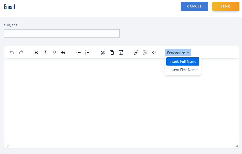 A new 'Personalize' option now appears in the toolbar when creating emails. The dropdown allows inserting either the user's full name or just their first name.
