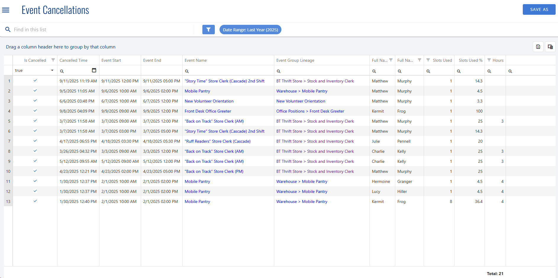 The report is helpful for seeing how many times a specific person has cancelled or tracking cancellations across Event Groups.