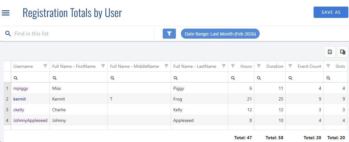 The Event Registration and Hours reports allow for filtering based on a data range via the pill at the top of the report.